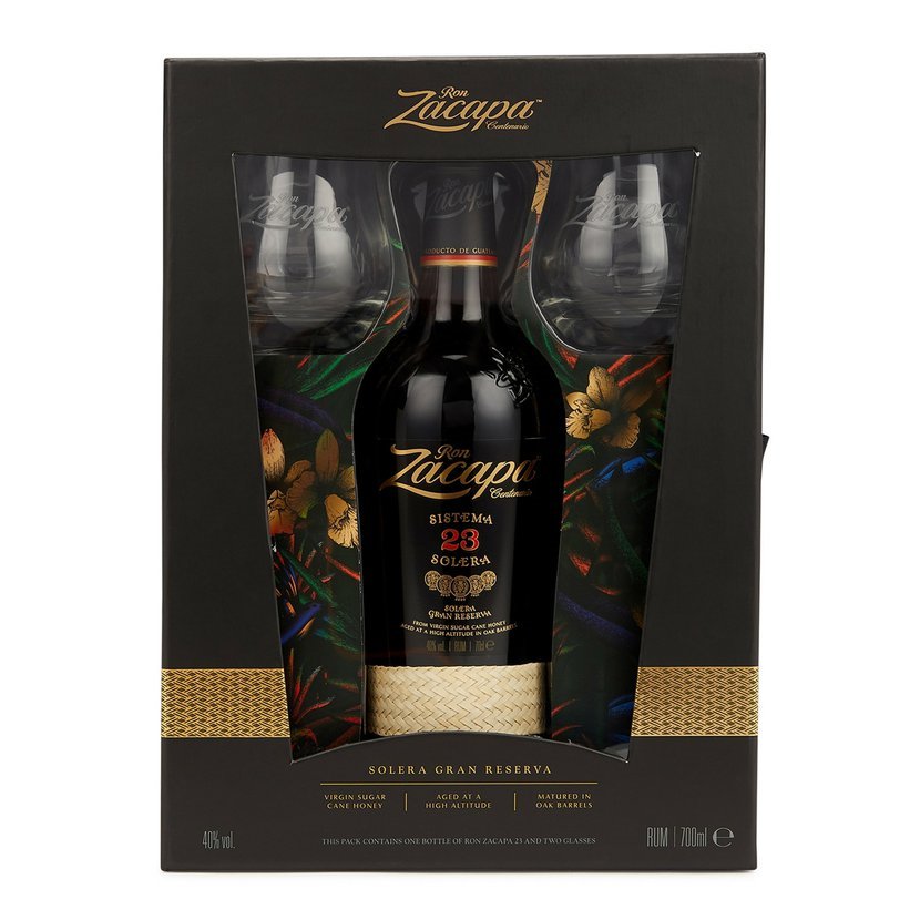 Dárkový set Ron Zacapa Centenario 23y se dvěmi skleničkami Zacapa.
